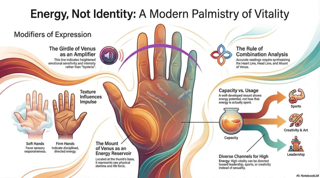Palmistry can indicate emotional intensity, vitality, and desire patterns, but it cannot define a person’s orientation or label their sexuality. A full hand analysis is required.